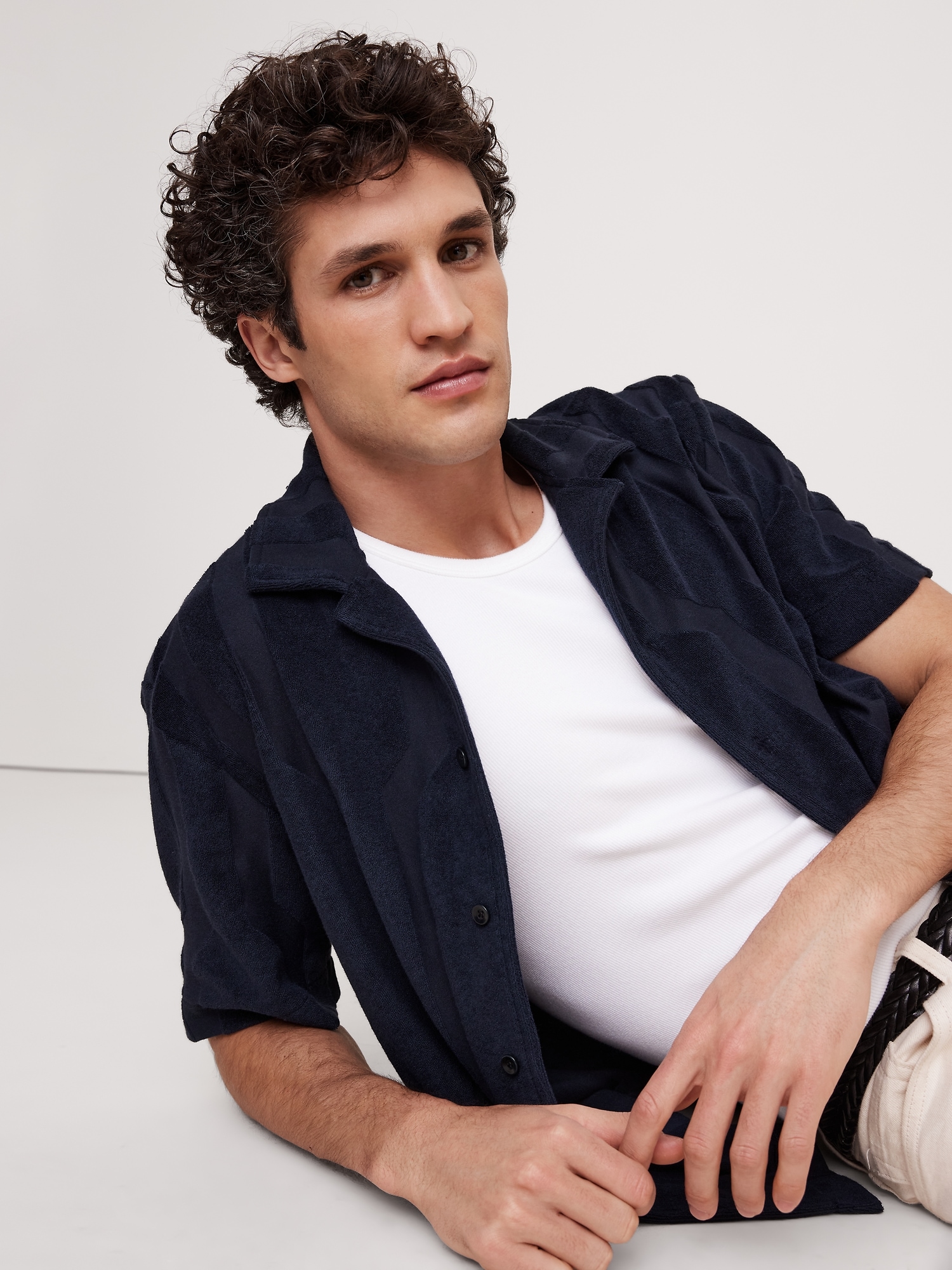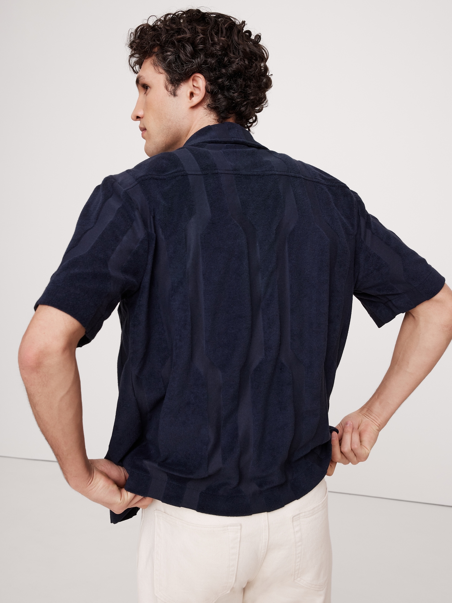 A classic resort shirt, made for warm-weather in a toweling terry fabric in a geometric pattern.