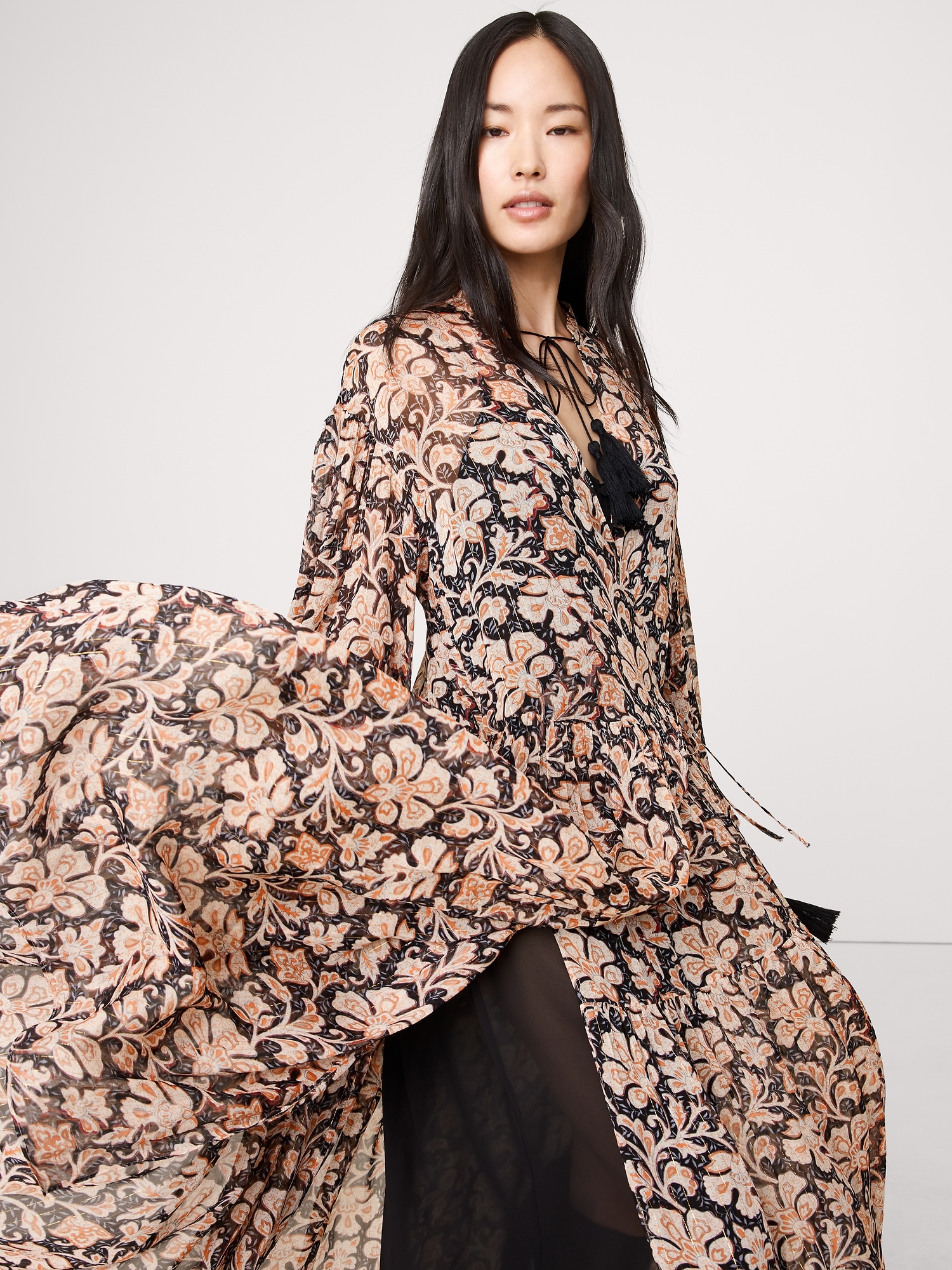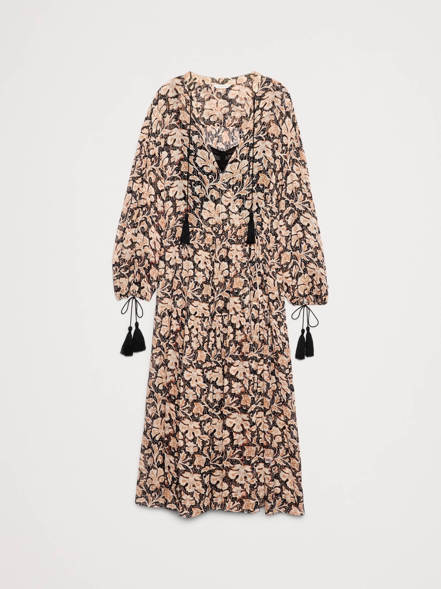 Look closely: this tiered maxi dress is cut from lighter-than-air chiffon with subtle, metallic lurex stripes. Plus, we added a camisole slip lining and tassels at the collar and cuffs.