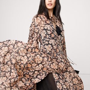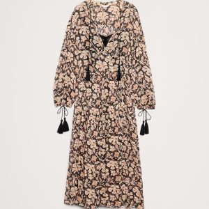 Look closely: this tiered maxi dress is cut from lighter-than-air chiffon with subtle, metallic lurex stripes. Plus, we added a camisole slip lining and tassels at the collar and cuffs. Shift fit: Relaxed shoulders, straight through bust, waist and hip with a straight skirt. Banded collar with tassel tie closure. Camisole slip lining. #818164