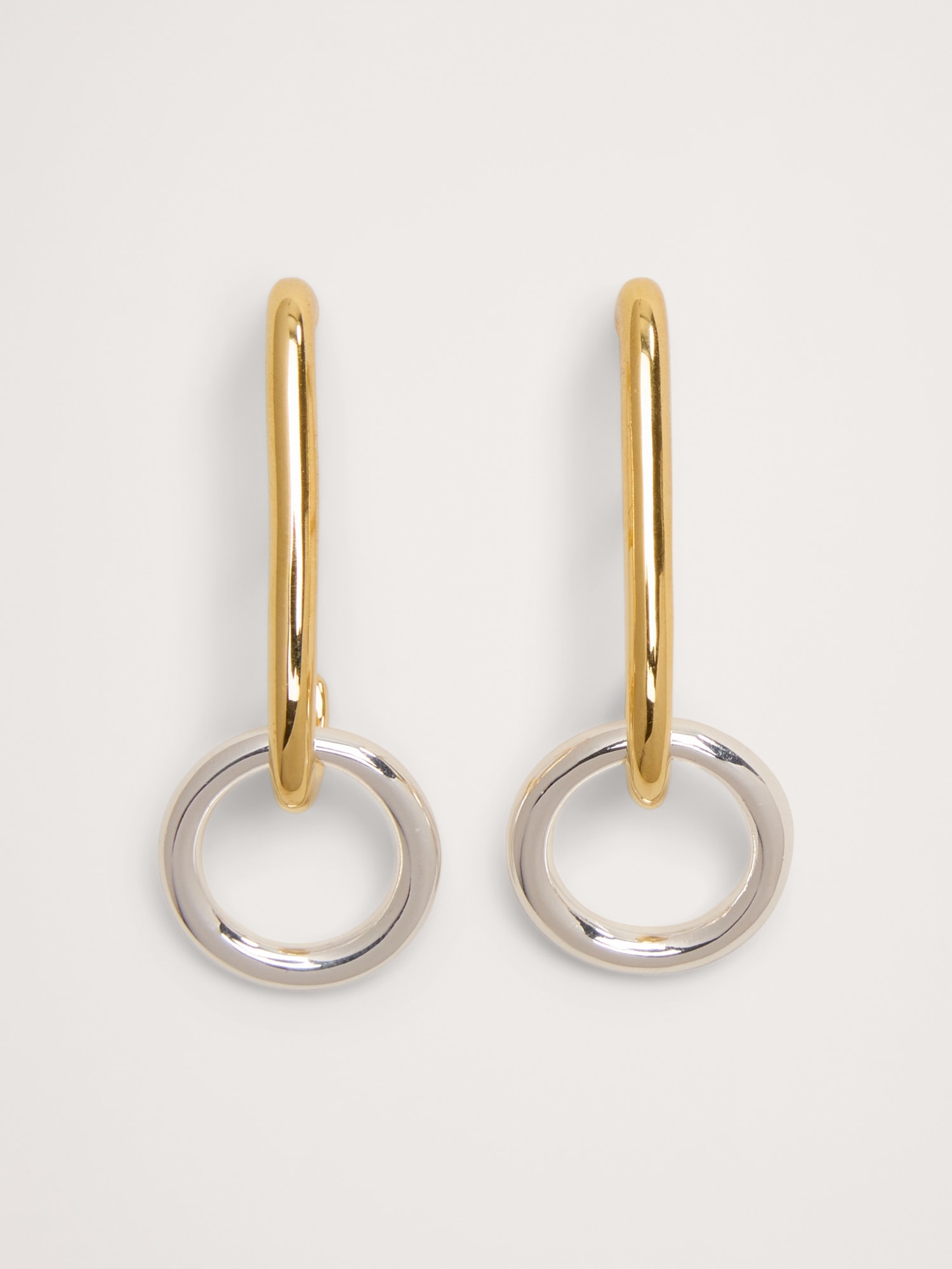 A reimagining of the classic doorknocker style in mixed metals. Gold ear cuff holds a silver ring, rendered in 999-silver and 14-karat gold plated brass.
